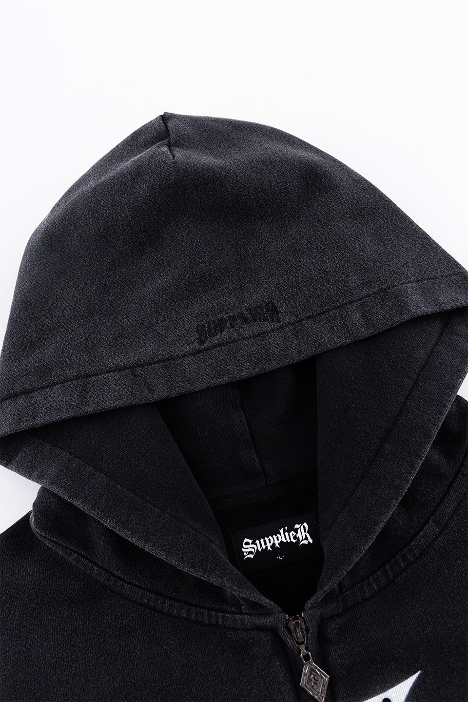 全体にウォッシュ加工を施し、フード周りやポケット口、リブに軽くダメージを入れることでヴィンテージの風合いをプラスしました。