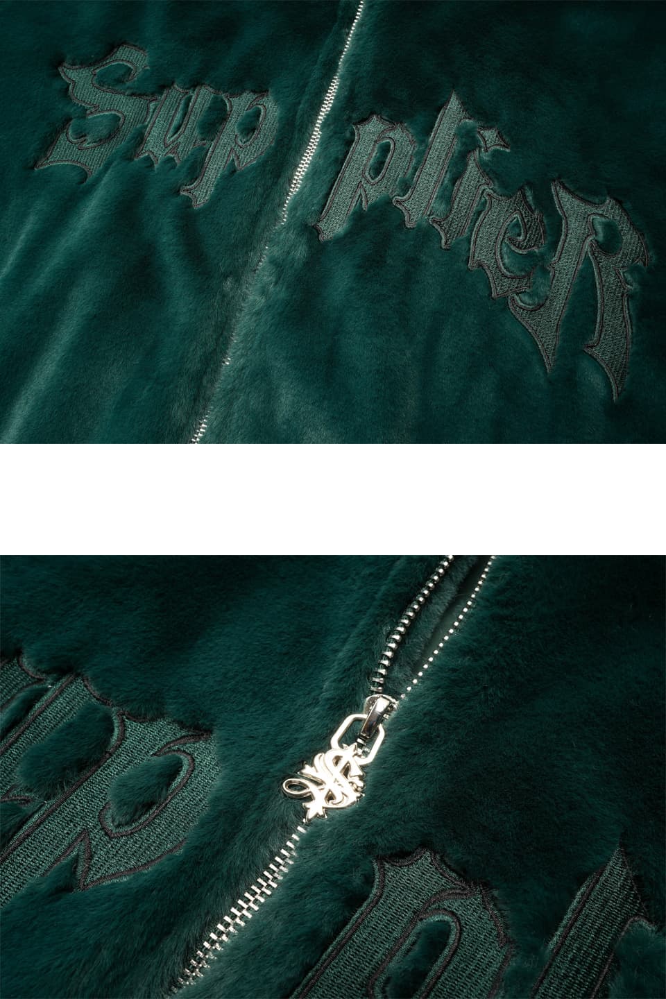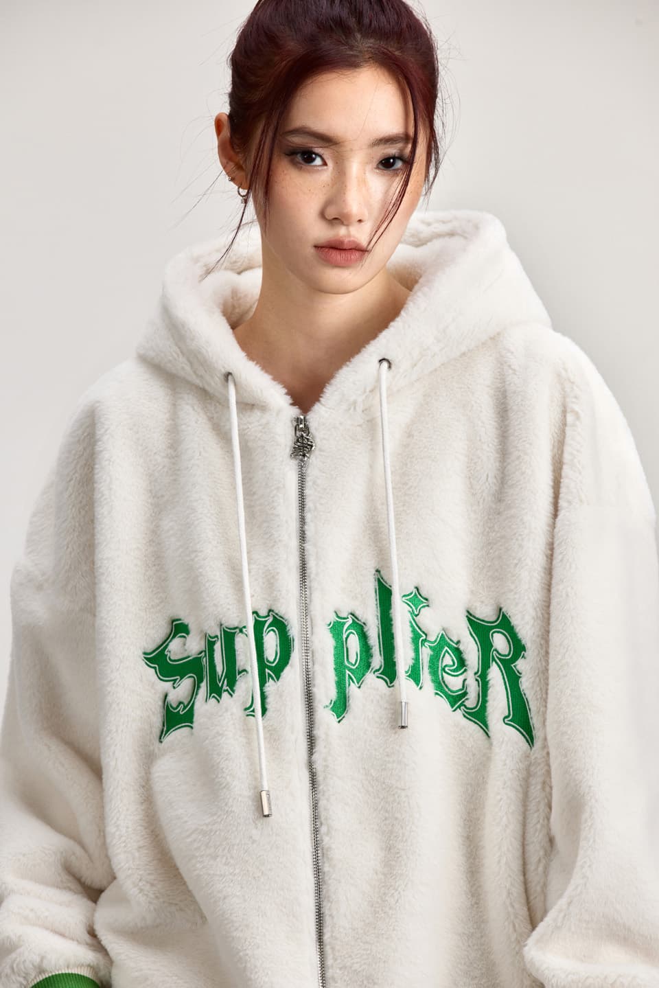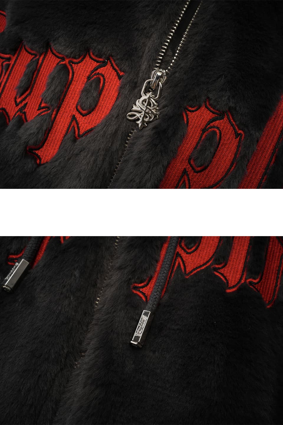 ミンクの肌触りを意識して作られたエコファーを使用したワイドシルエットのZIP HOODIE。ミンクエコファーの裾と袖口にはウール混のバイカラーオリジナルリブを使い、胸部分にはブランドロゴにアウトラインをつけた9万針以上の高密度刺繍を配置。ファスナーの引き手、フード部分のスピンドル口の金属ハトメカン、スピンドル先のヘキサゴン型のコードエンドに至るまで全てオリジナルのアタッチメントを使用。