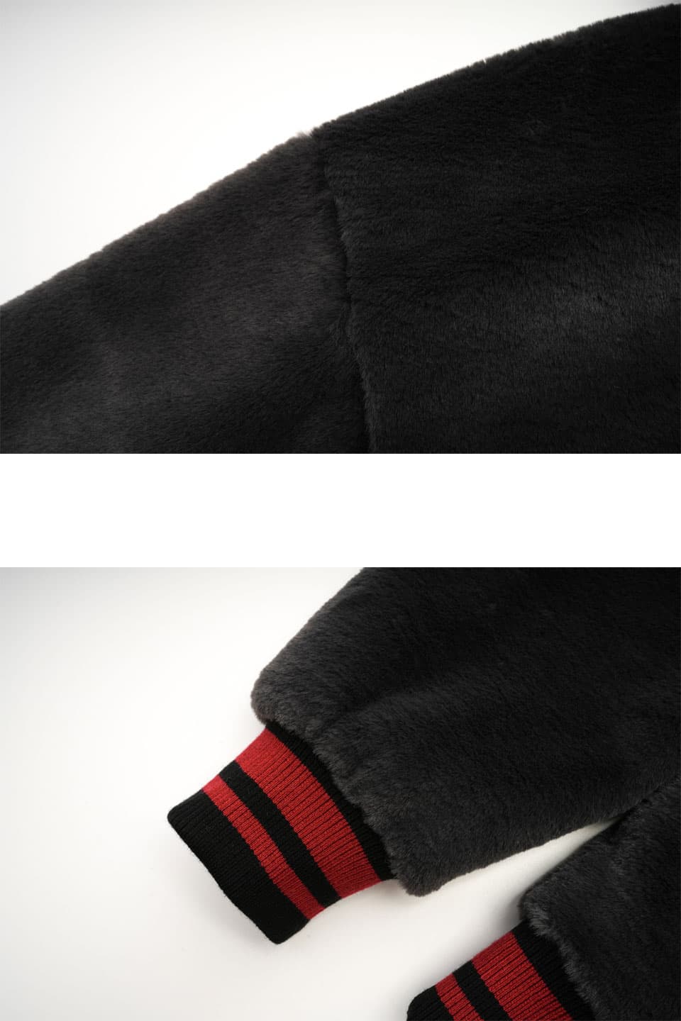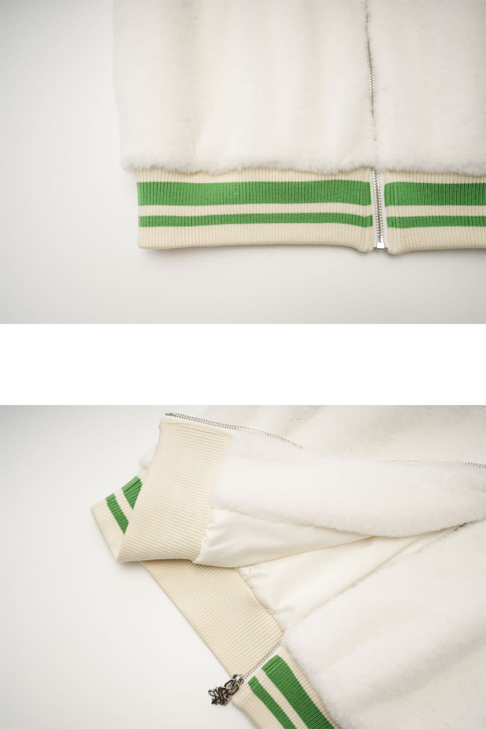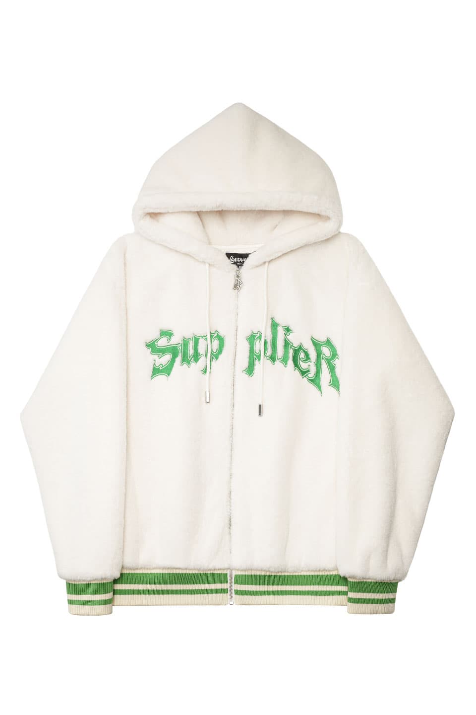 ミンクの肌触りを意識して作られたエコファーを使用したワイドシルエットのZIP HOODIE。ミンクエコファーの裾と袖口にはウール混のバイカラーオリジナルリブを使い、胸部分にはブランドロゴにアウトラインをつけた9万針以上の高密度刺繍を配置。ファスナーの引き手、フード部分のスピンドル口の金属ハトメカン、スピンドル先のヘキサゴン型のコードエンドに至るまで全てオリジナルのアタッチメントを使用。