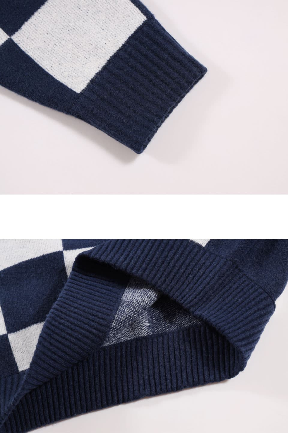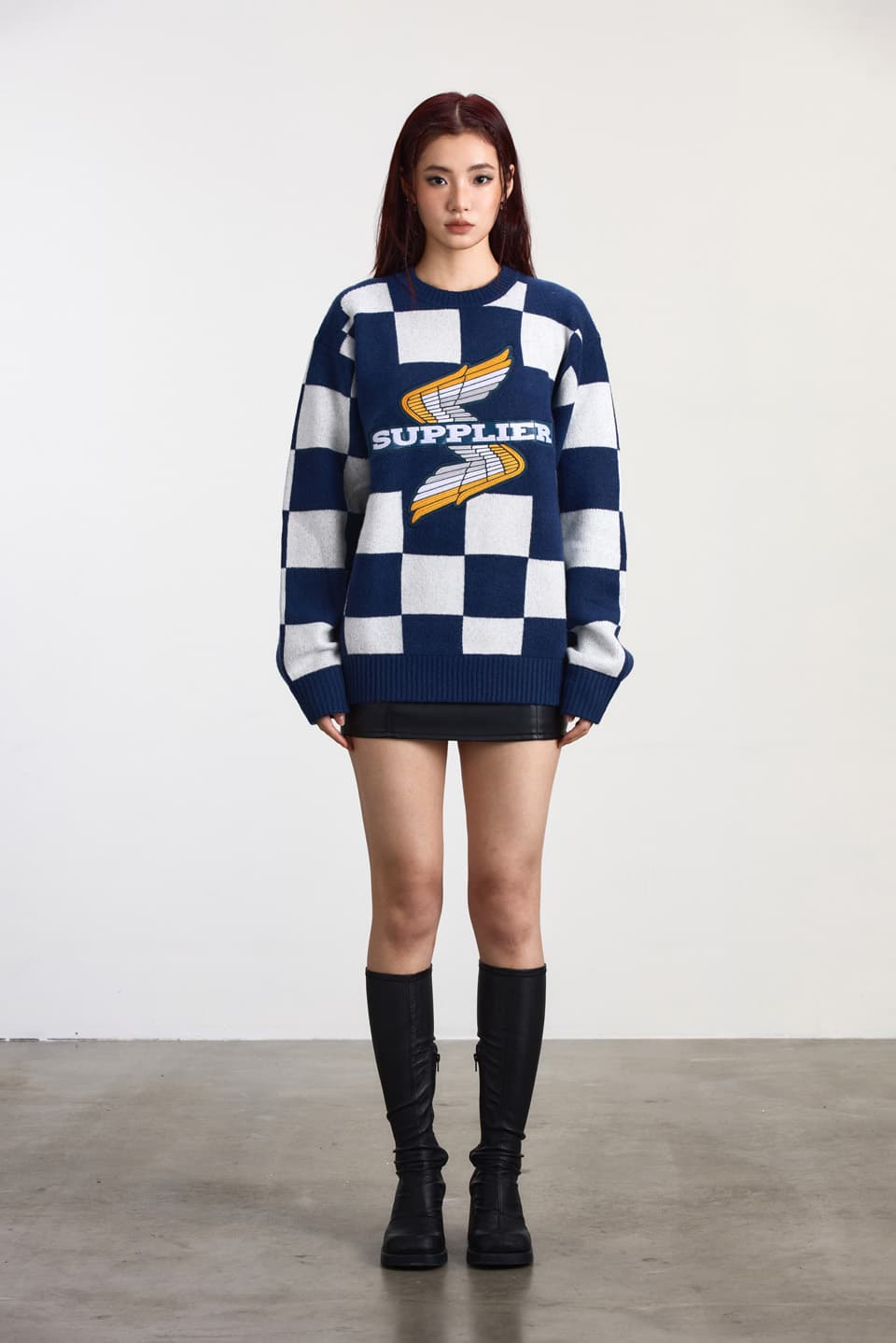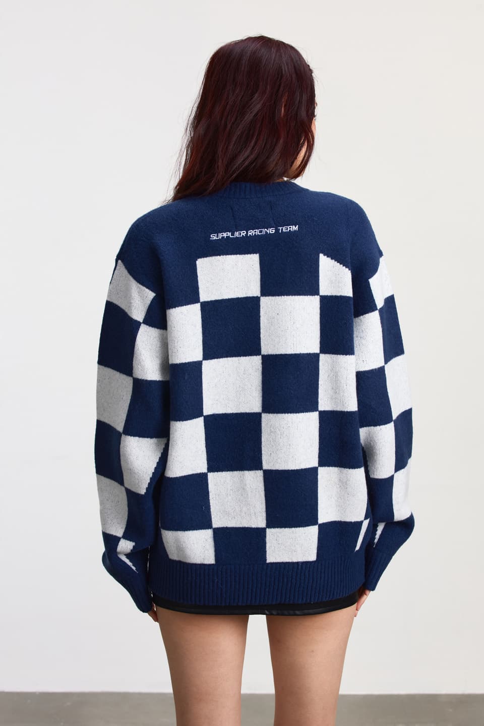 7ゲージのローゲージダブルジャカード機を用いて、アクリル×ウールにポリウレタンを入れた特殊糸でチェッカーフラッグ柄を編み上げたクルーネックニット。
